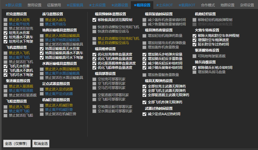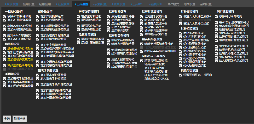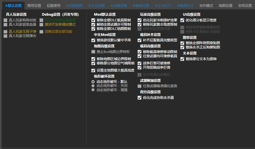 自带简体中文,删除空气墙,取消飞机限高,增强滑铲,补齐载具类型,载具边移动边维修,开局刷巨兽